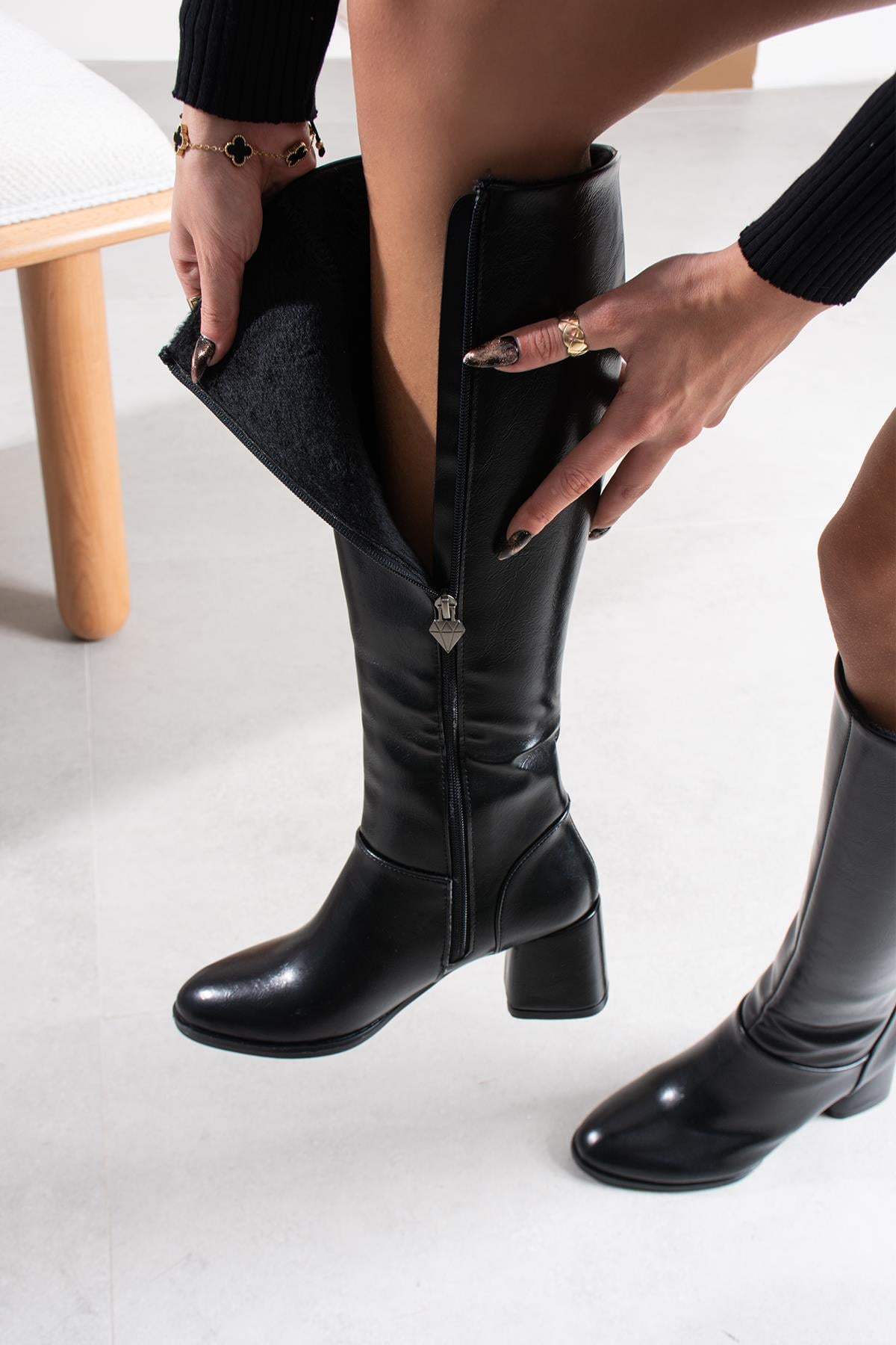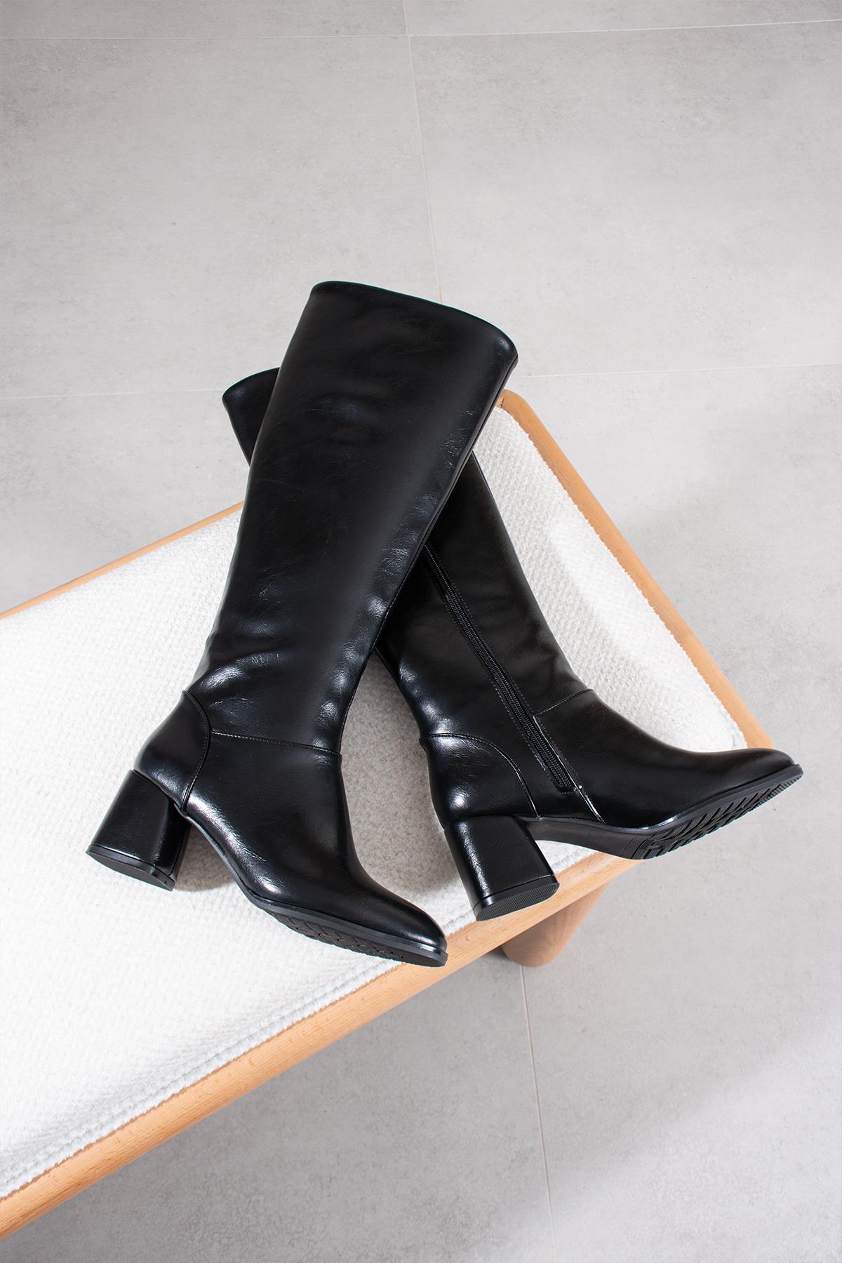 Loger Kadın Siyah Deri Alçak Kalın Topuklu Çİzme (FS1157)